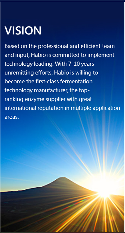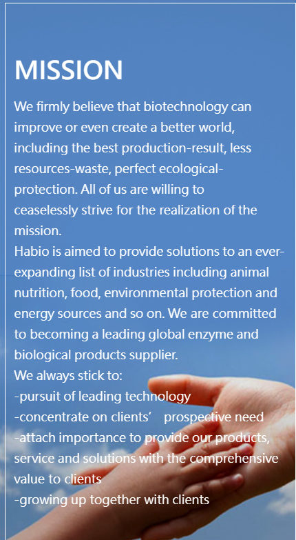 Habio is een globale pionier in enzymonderzoek sinds zijn verwezenlijking in 2002 geweest. Het bedrijf werd opgericht door een diverse groep deskundigen in biologisch en diervoeding. Bij de kern van ons technisch team is M. Yang Tao, de van wie visie om een internationaal enzymbedrijf te creëren in succes van de de wereld het belangrijke industrie van Habio vandaag heeft geresulteerd.